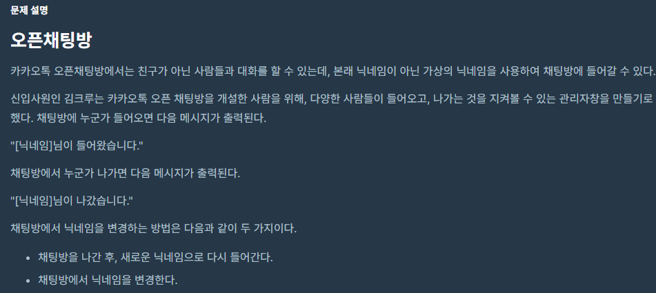 말 그대로 카카오톡에서 사용되는 오픈채팅방의 기능을 구현하는 문제이다.