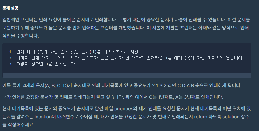 해당 priorities배열은 중요도만 있고 중복이 있으므로 주어진 위치 location의 문서 중요도와 순서를 알아야합니다.