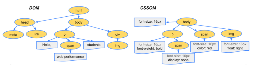 서버로 부터 받은 html, css은 각각 DOM Tree와 CSSOM으로 만들어 집니다.