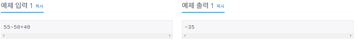 * JS에서는 eval 함수가 존재한다. eval은 문자열로 된 연산을 처리해주는 함수이다. 즉 "50-15+50" 이라는 문자열이 있다면 이것을 eval함수를 이용하면 알아서 수식처리를 해주는 아주 유용한 함수이다. 그래서 나는 -기준으로 나눈후 각각의 연산을 eval로 해주어서 제출했는데 실패 처리가 되었다. 결과값과 과정은 동일한데 실패 처리가 된다. 아마 백준에서 node.js가 완벽히 지원안되는 탓인거같다.