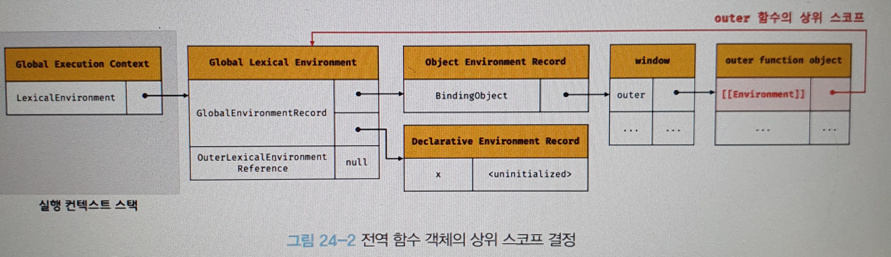 그리고 렉시컬 환경의 외부 렉시컬 환경에 대한 참조는 inner 함수 객체의 [[Enviroment]] 내부 슬롯에 저장되어 있는 참조값이 할당된다.