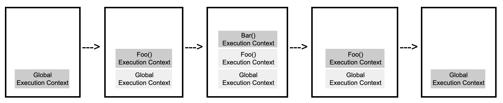 다음 예제의 foo 함수와 bar 함수는 호출된 순서대로 실행 컨텍스트 스택에 푸시되어 실행된다.