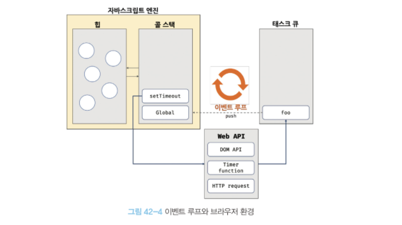 따라서 4ms 후에 콜백 함수 foo가 태스크 큐에 푸시되어 대기하게 된다. 이 처리 또한 자바스크립트 엔진이 아니라 브라우저가 수행한다.