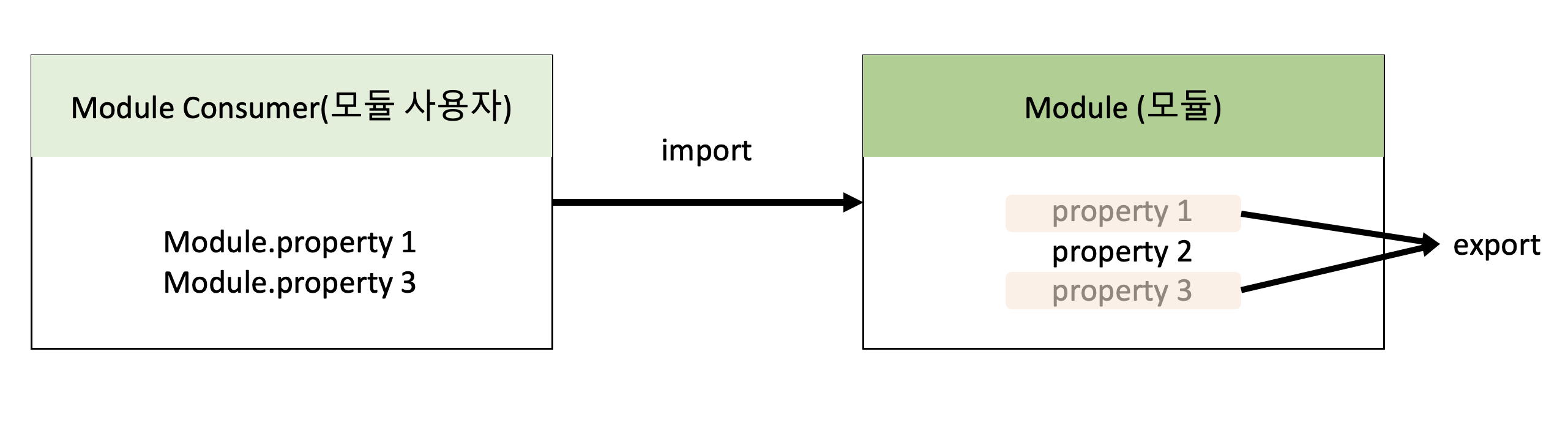 하지만 완전히 분리되어 개별적으로 존재하면 재사용이 불가능하므로 모듈은 공개가 필요한 곳에 한정하여 명시적으로 공개가 가능하다. 이를 export라 한다.