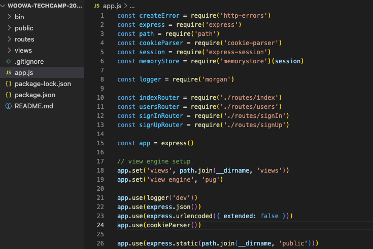 웹 프레임워크인 express를 사용하여 서버 구축을 간결하게 하고 필요한 패키지와 구조를 잡아주는 generator을 이용하여 기본 환경 세팅을 이용했다. 그리고 view 엔진 Pug를 이용하기 위해 기본 환경 세팅을 다음과 같이 가져갔다.