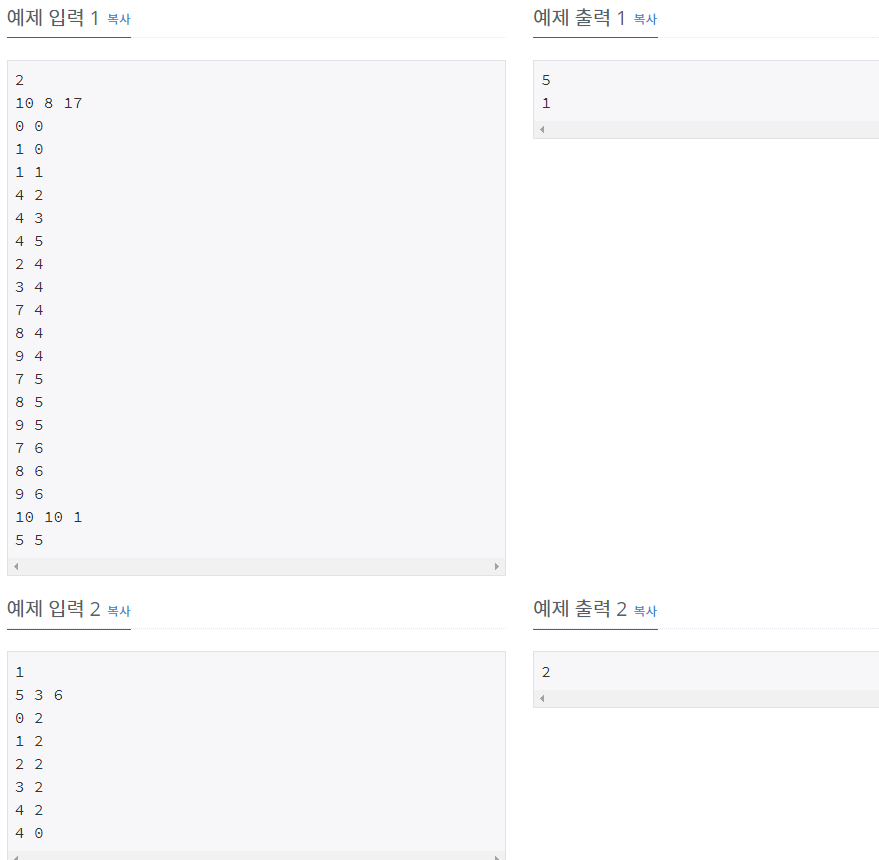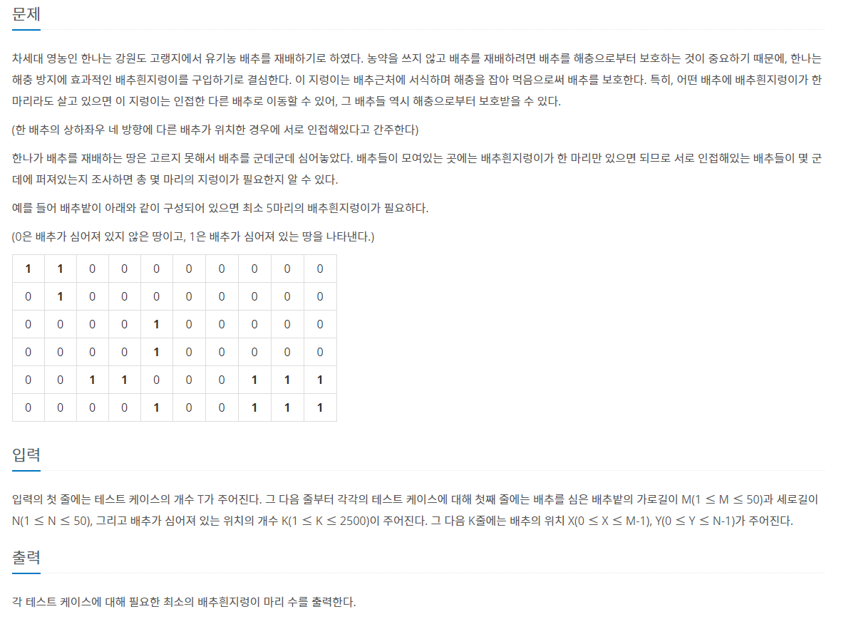 //일반적인 DFS와 다르게 정점과 간선으로 이루어진 그래프가 아니라 배추의 위치가 주어지기 때문에