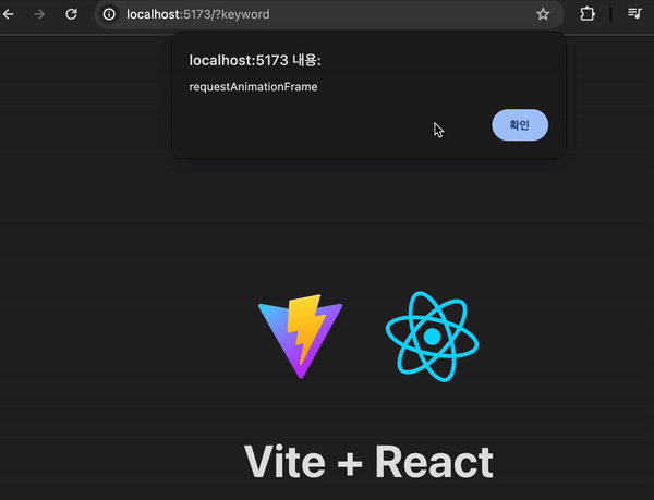 이제 결과를 보면 하위의 Vite+React 글자가 보이고 난 후 alert를 띄우는 것을 볼 수 있습니다!!! 🥳🥳🥳🥳🥳🥳🥳🥳