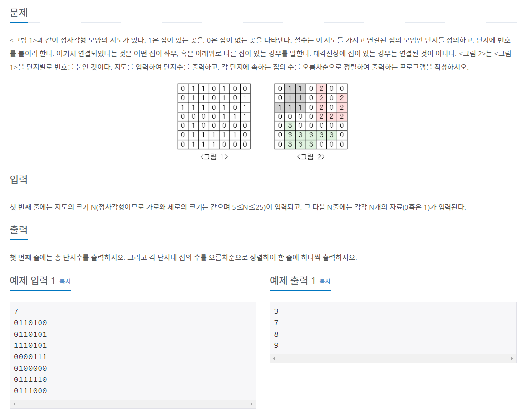 문제 풀이 : 이 문제도 기본 DFS 유형을 요구하는 문제이다. 그래프 전체를 순회하면서 방문하지 않았다면 (이 문제에서 1과 0은 아파트의 위치이면서 방문여부로도 활용할 수 있다.) DFS를 호출한다. 여기서 DFS내부적으로 재귀를 부를때마다 선언해둔 글로벌 변수(home)를 한개씩 카운트 해주면서 같은 단지내의 아파트 개수를 세려주고 DFS함수 호출이 끝나면 하나의 단지를 탐색한 것이기 때문에 순서대로 배열에 넣어주면된다.