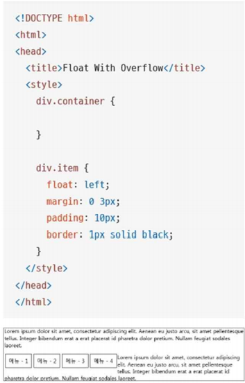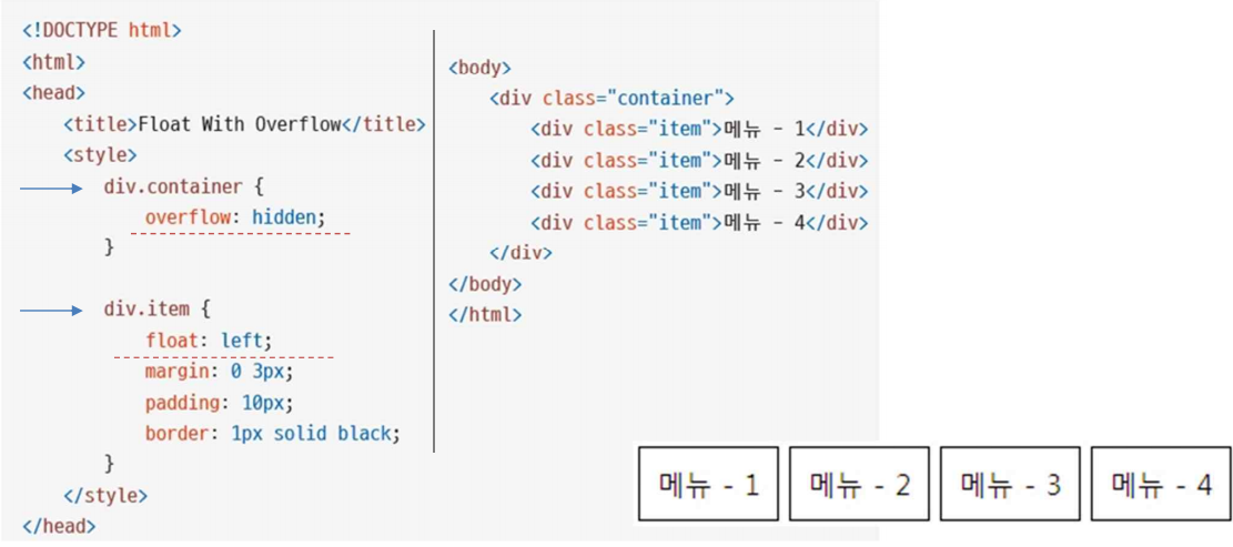 자손에게 float 속성을 지정, 부모의 overflow 속성을 hidden으로 적용