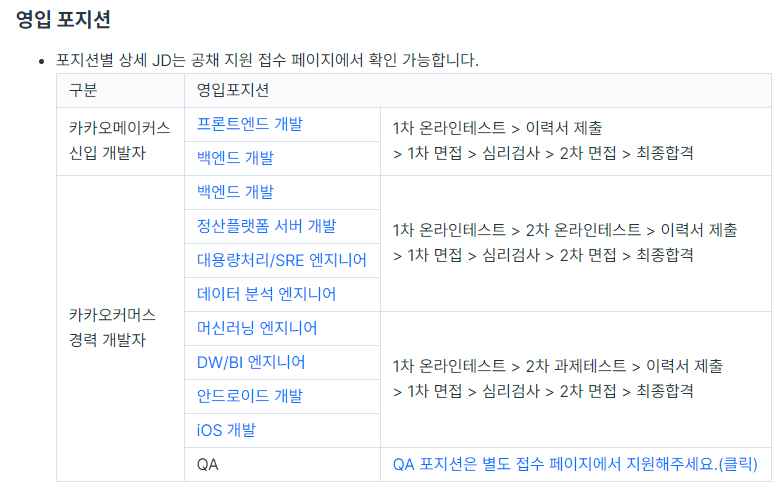 이번 "2021 카카오커머스 개발자 공개채용"은 경력, 신입으로 나누어져있고 각각에서 포지션별로 다르게 지원할 수 있게 되어있었습니다.