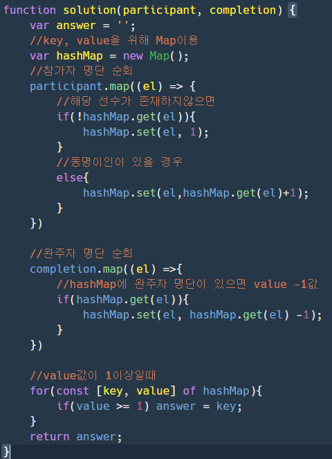 2. 완주자 명단(completion)을 순회하면서 Map함수에 key(선수이름)이 있을시, value: -1을 해준다.