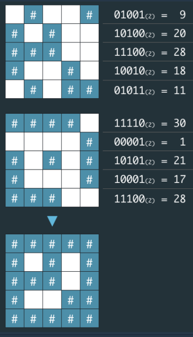 1. 암호화된 두개의 지도를 2진법으로 변환