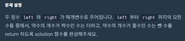 문제 설명 : 주어지는 숫자 사이에 약수들의 개수를 판별해서 짝수개면 해당 수를 더하고 홀수개면 해당 수를 빼면된다.