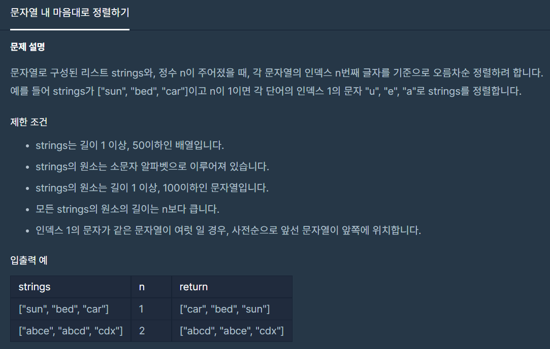 문제 설명 : 문자열 배열과 n이 입력으로 주어질때 문자열의 n번째 기준으로 정렬했을때 반환되는 순서대로 문자열을 리턴해주면 된다.