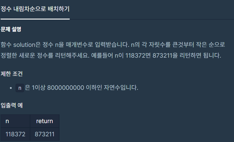 프로그래머스 Level1 정수 내림차순으로 배치하기