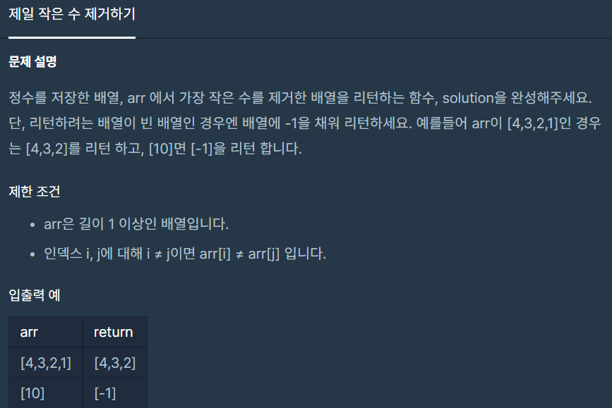 문제 설명 : 제일 작은 수를 제거하는 간단한 문제이다. 하지만 배열의 순서가 섞이면 안되므로 정렬을 하면 안된다.